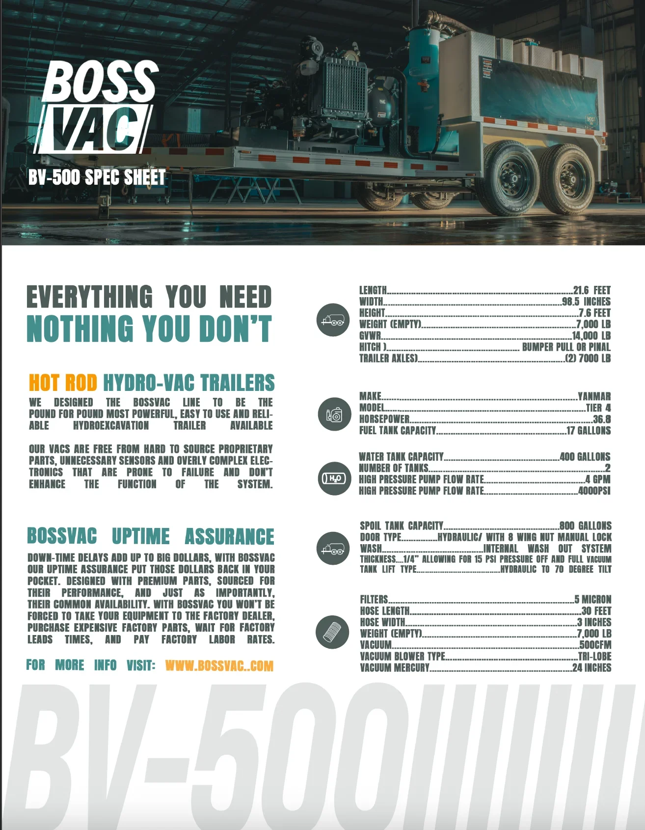 The BV-500 is a reliable, well-built, user friendly hydro-vac trailer built in Oklahoma City. More powerful than the competition, fully customizable from the factory and available for quick delivery. Ditch the corporate equipment waiting list and leave your competition in the dust.